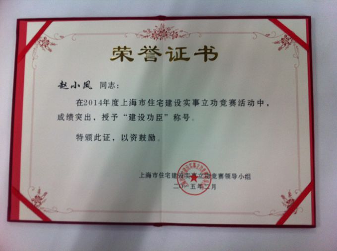 祝賀趙小鳳女士在2014年度上海市住宅建設實事立功競賽活動中,獲得”建設功臣“稱號。