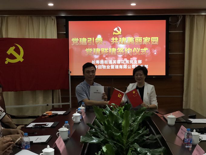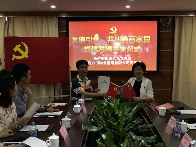 2018年6月28日,由市物業(yè)協(xié)會黨建工作指導(dǎo)委員會普陀分會和沙田物業(yè)聯(lián)合舉辦的“黨建引領(lǐng)共建美麗家園,迎七一黨建聯(lián)建工作推進(jìn)會暨共建協(xié)議簽約儀式”在沙田物業(yè)公司總部舉行。長壽路街道黨建辦、長壽路街道九茂黨總支、長壽路街道芙蓉花苑黨支部、長壽路街道上青佳園黨支部、曹楊新村街道沙溪園黨總支出席本次會議,沙田物業(yè)黨支部、公司職能部門參會。