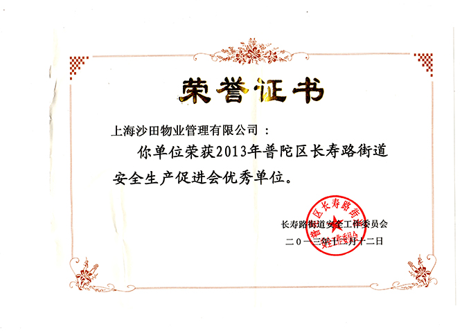 2013年普陀區(qū)長壽路街道安全生產(chǎn)促進(jìn)會優(yōu)秀單位