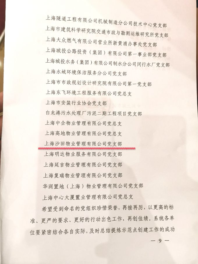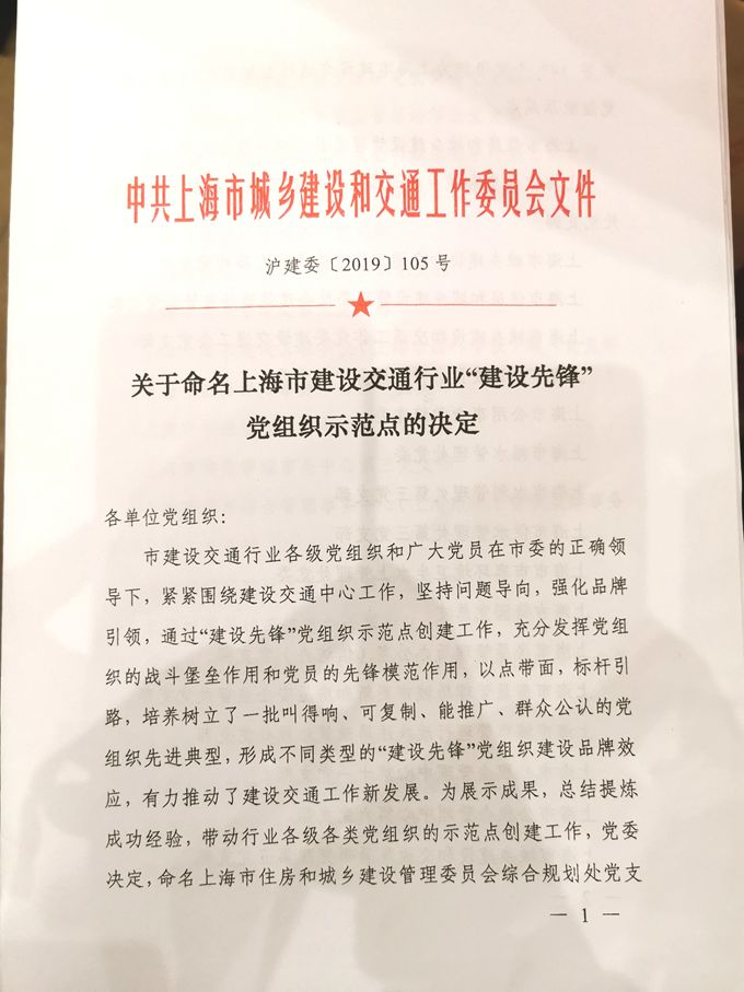 2019年6月,沙田物業(yè)黨支部被中共上海市城鄉(xiāng)建設(shè)和交通工作委員會(huì)授予“建設(shè)先鋒”示范點(diǎn)稱號。